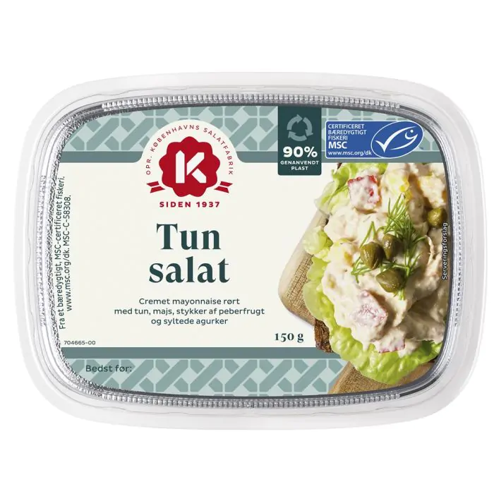 34% TUN (96% TUN, vand, salt), vand, rapsolie, 13% kogte majs, 7% syltet peberfrugt, 4%